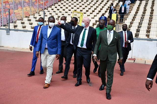 FIFA president, Gianni Infantino with Sports Minister, Mr Sunday Dare during the inspection of Moshood Abiola Stadium, Abuja